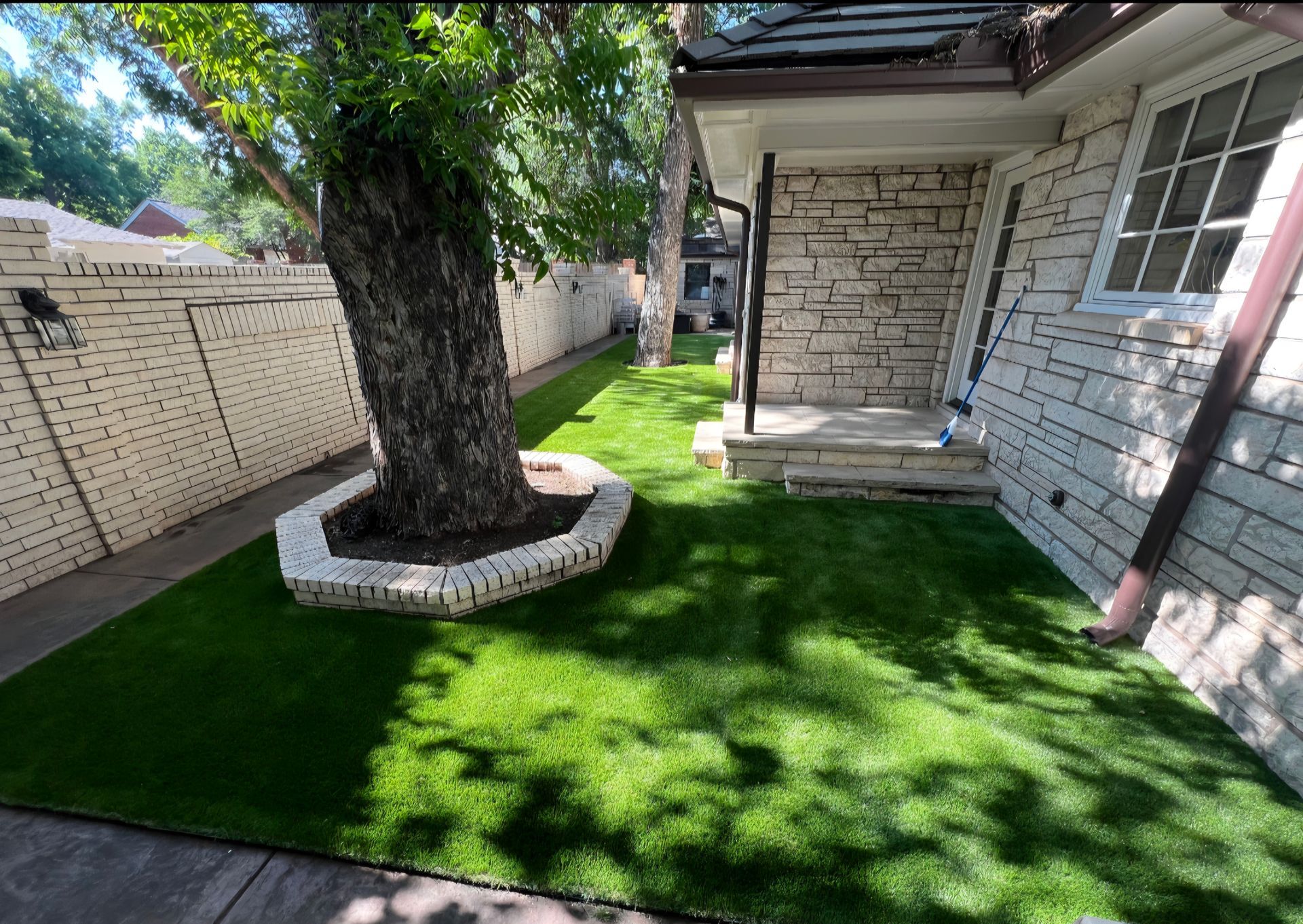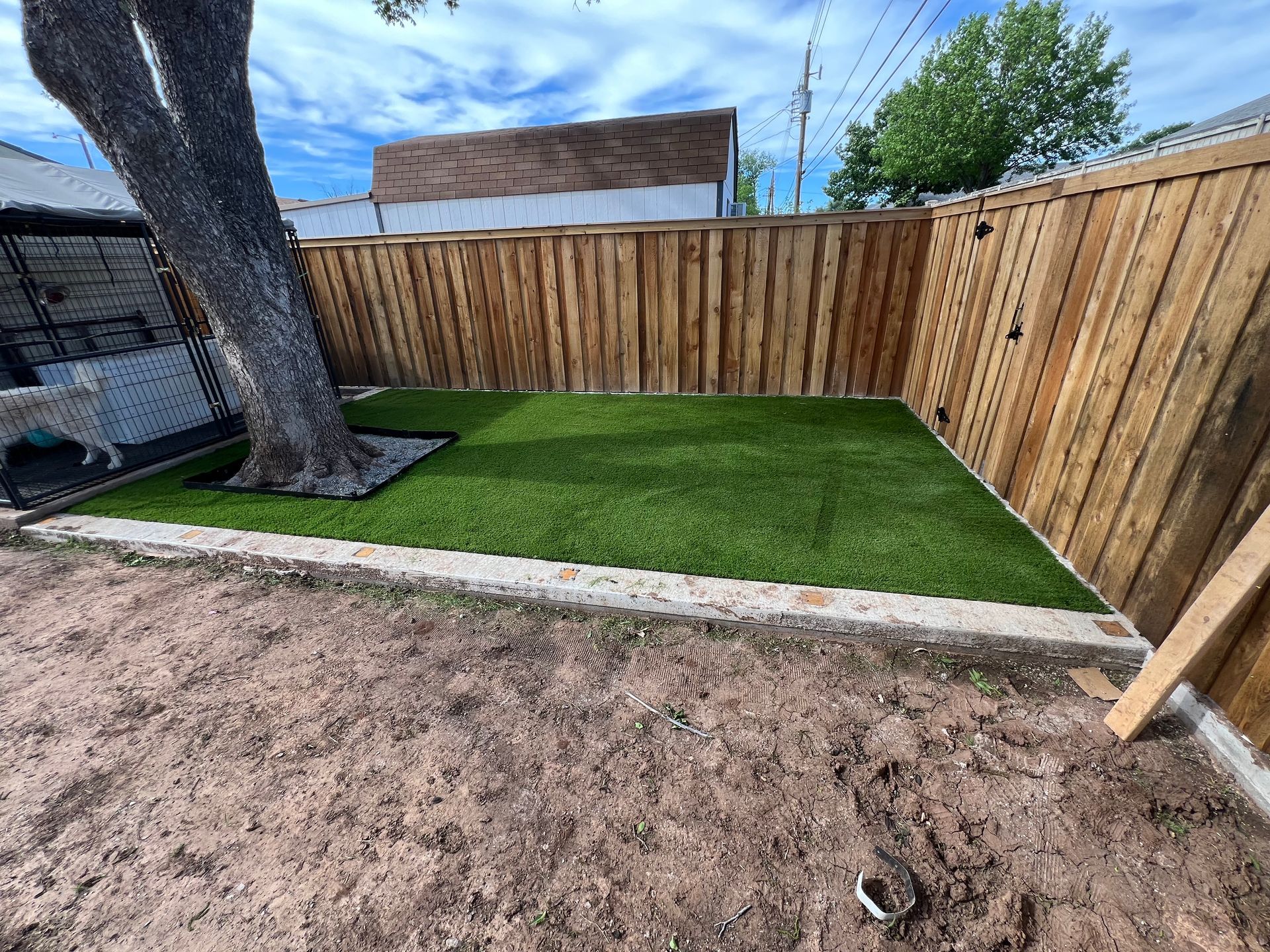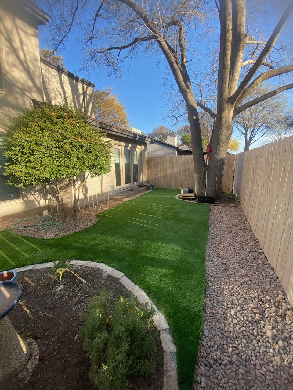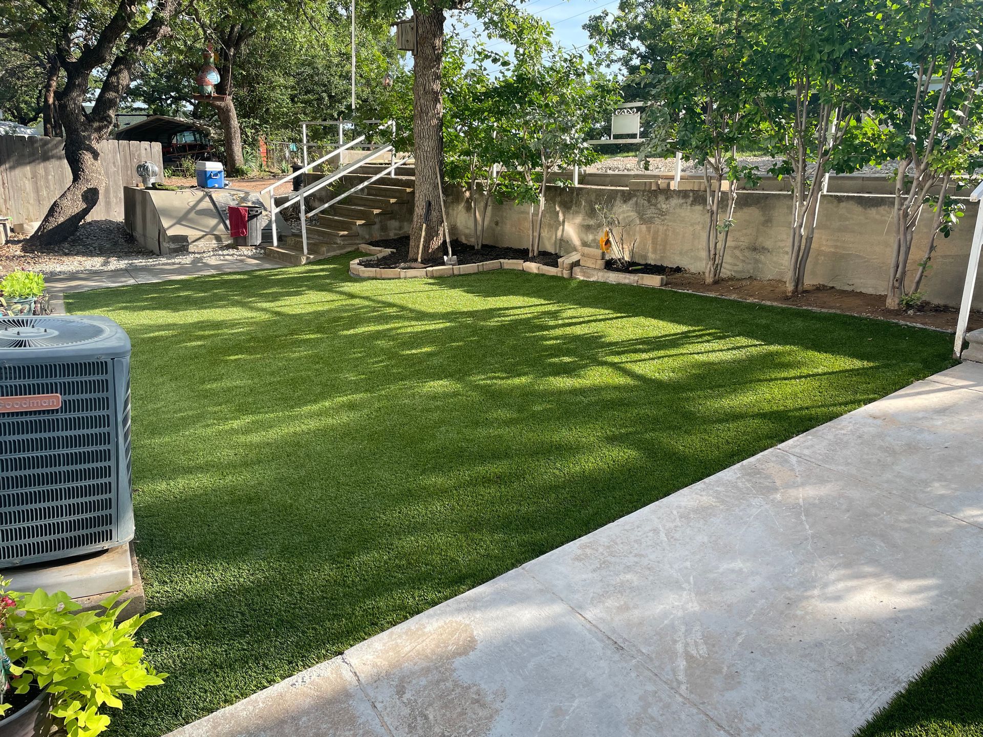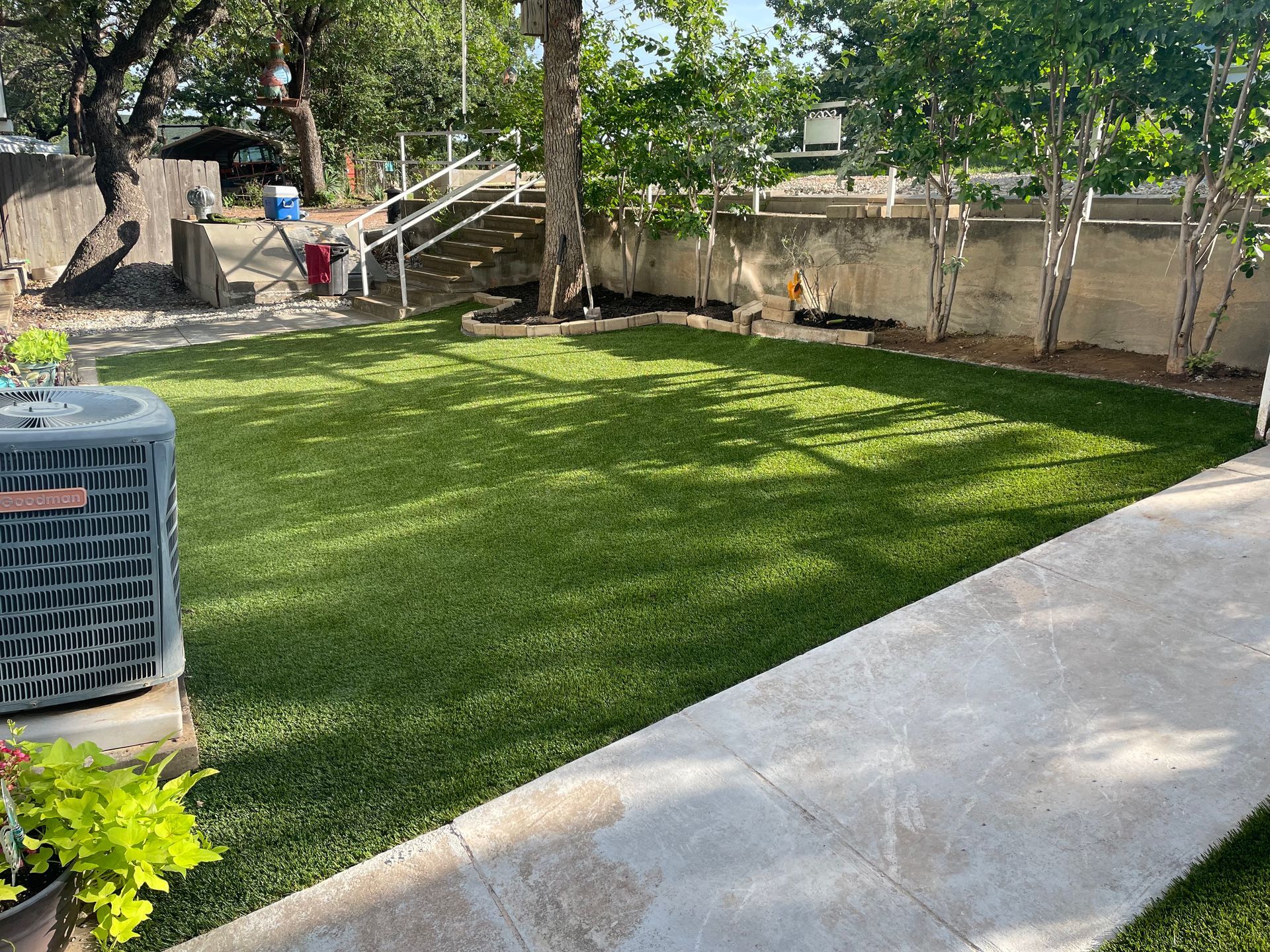 ForeverLawn Before and After Photos of a Backyard without and with a synthetic lawn.